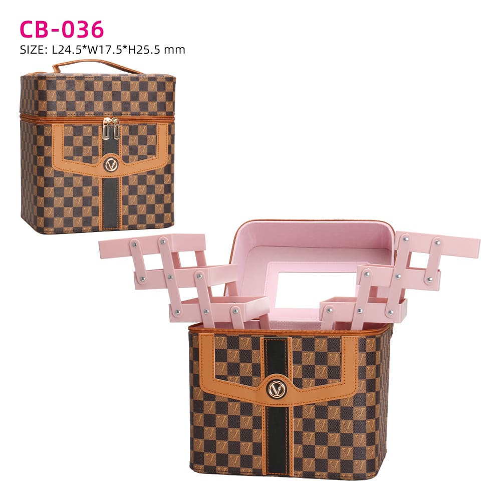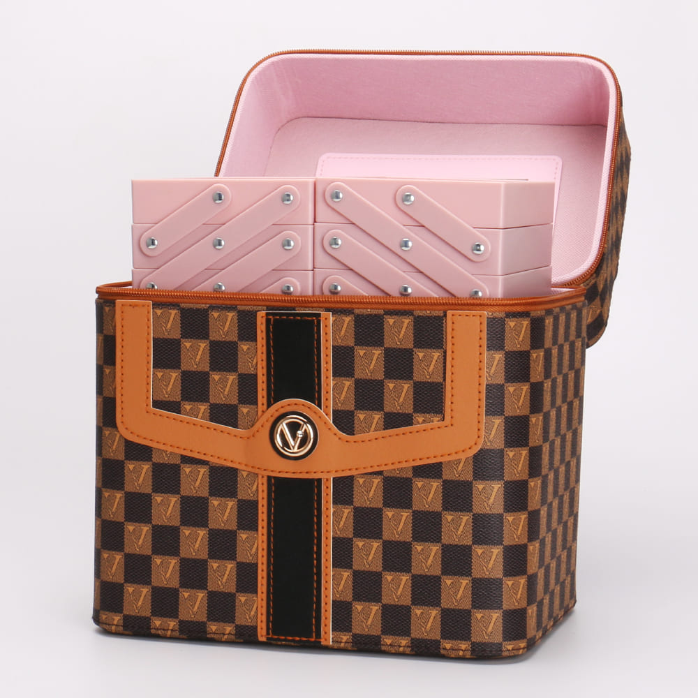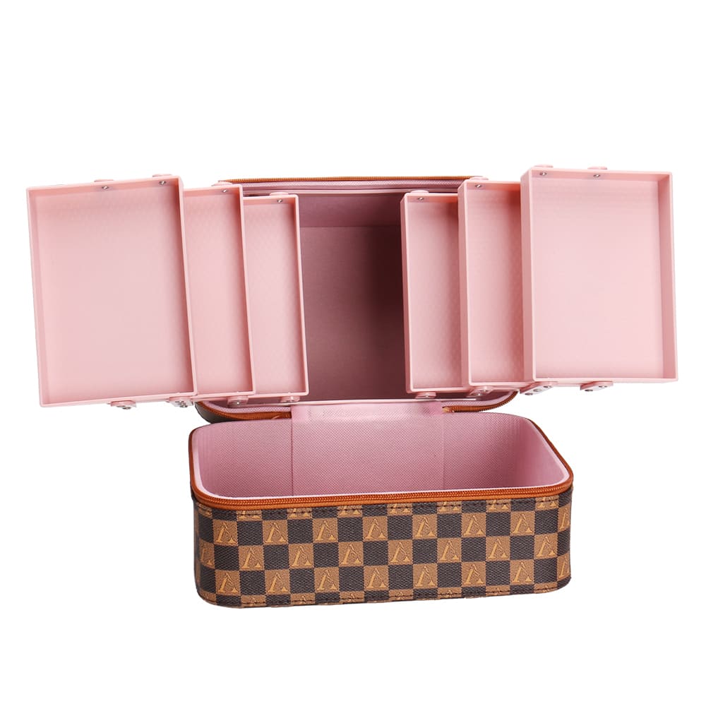 Checkered Makeup Train Case with Fold-Out Trays and Mirror